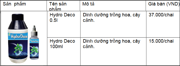 Dưới đây là bảng giá chi tiết cho dung dịch Hydro Deco loại 0.5l và 100ml.