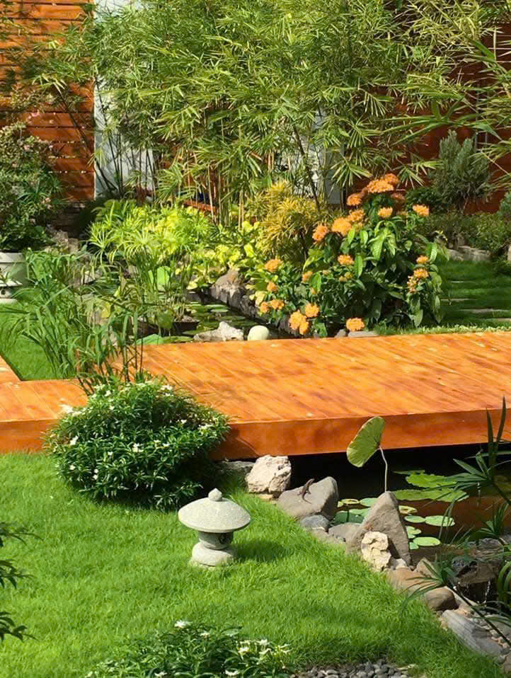 Trang trí: đèn đá, chum nước, tiểu cảnh suối nhân tạo hoặc cầu gỗ cong.
