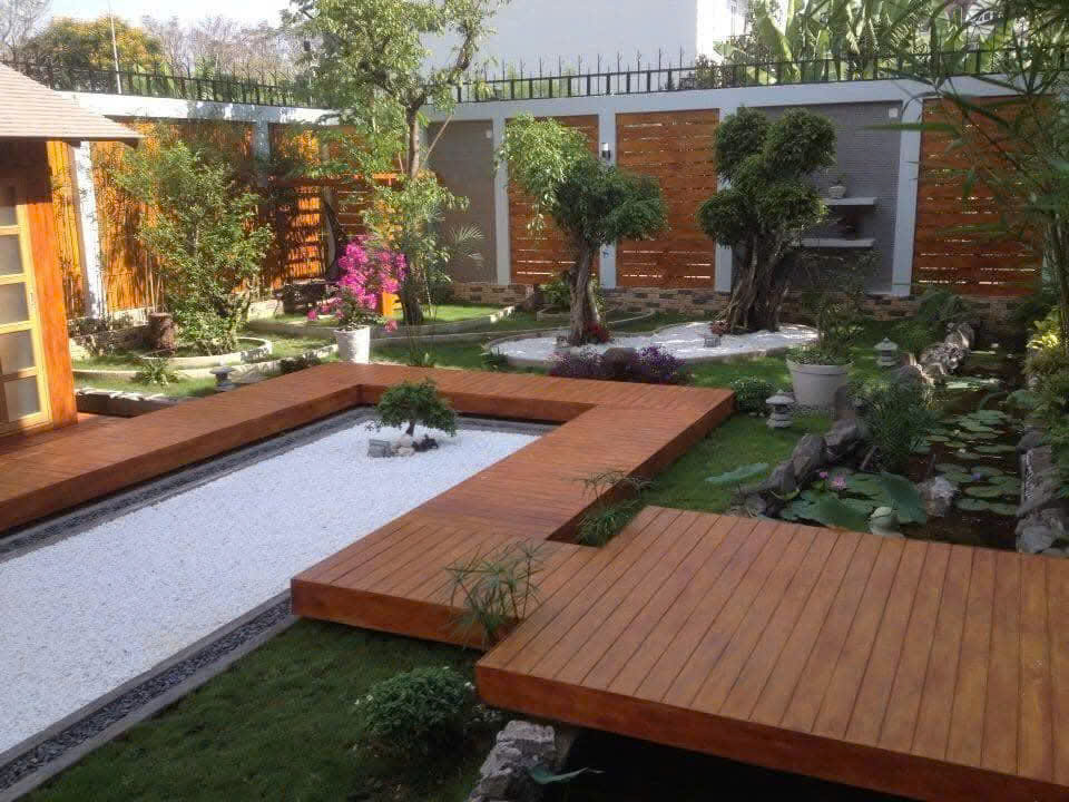 Lối đi: lát gỗ nhựa hoặc đá phiến xen kẽ sỏi trắng, tạo hiệu ứng mềm mại.